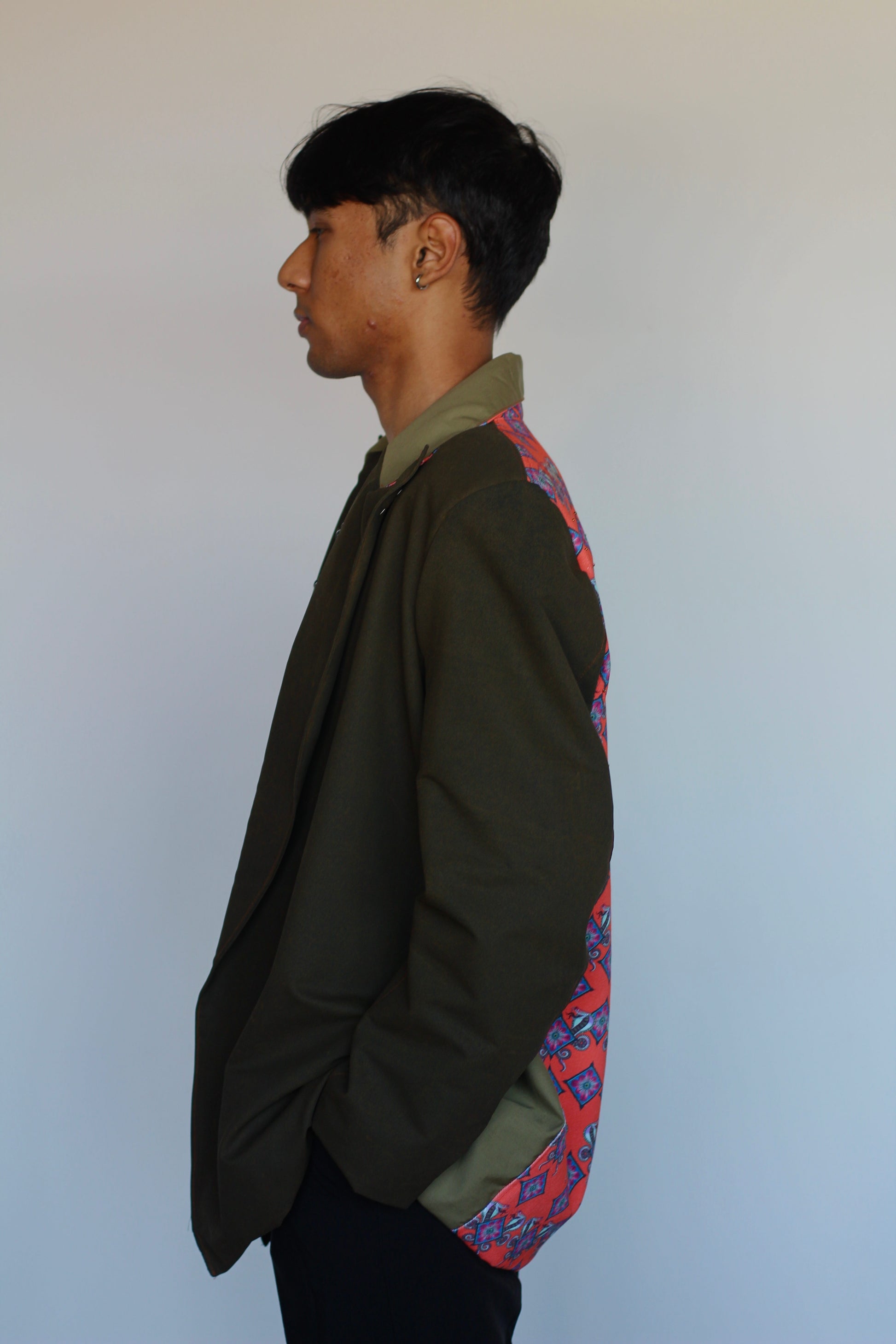This blazer is created to make you stand out. with 100% cotton denim digitally printed with our custom hand made prints and unique style lines. The two toned cotton blends provide the perfect contrast in color. The custom print is inspired by the designer's Indian heritage.